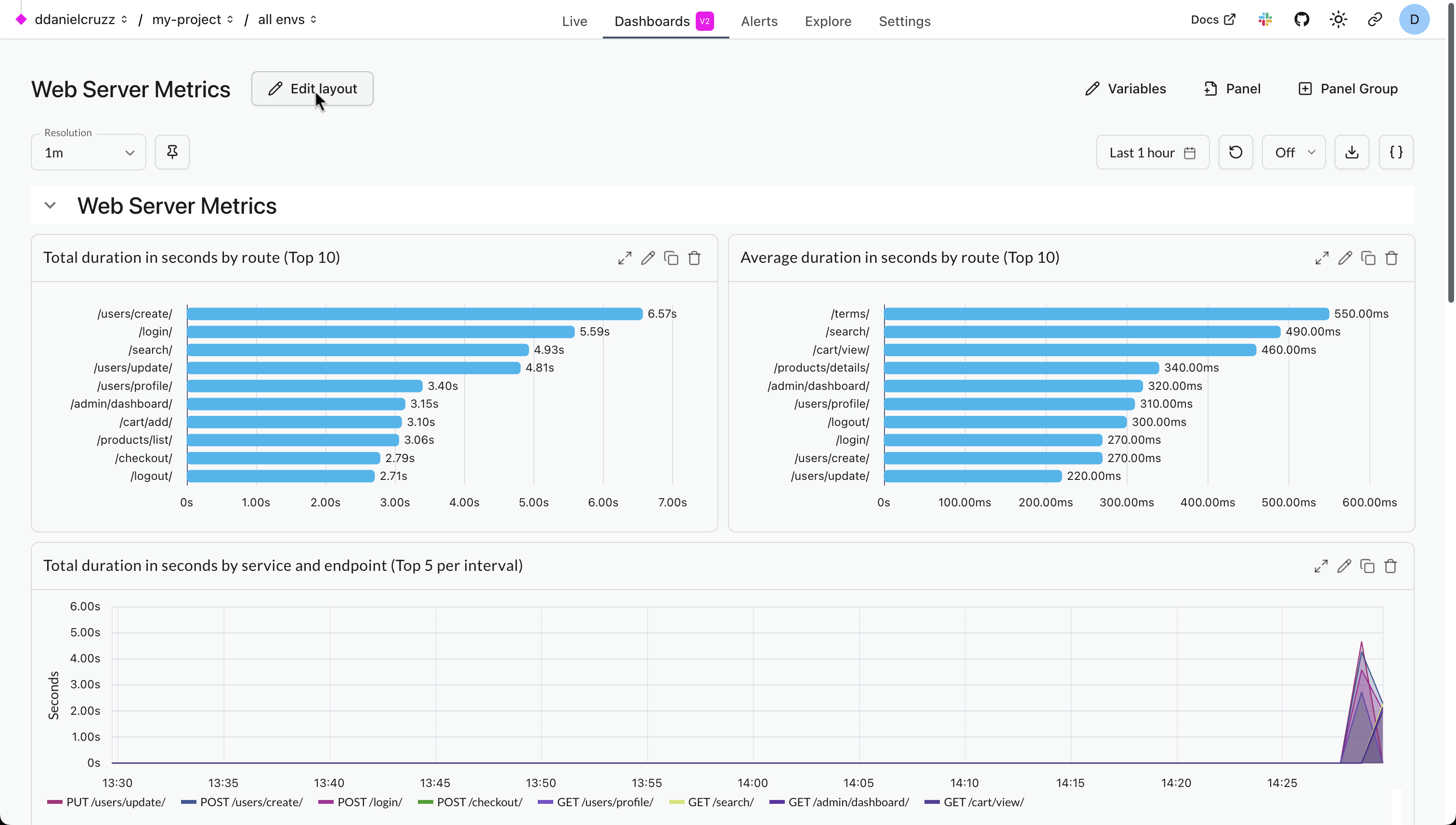 metric which is collected by many instrumentation libraries, including those for FastAPI, Flask, Django, ASGI, and WSGI. The charts give a breakdown by endpoint (and sometimes status code) both overall and over time. Hover over each time series to see the most impactful endpoint at the top of the tooltip. The charts show: