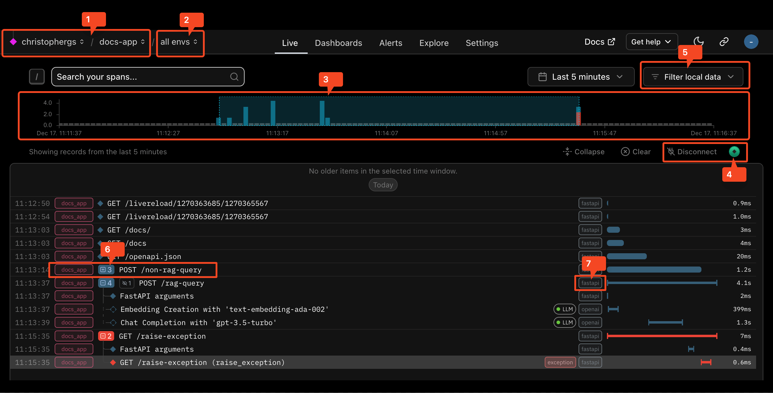 3. Exception warning: This exception indicator is present because an exception bubbled through this span. You can see more details in the Exception Traceback details tab.